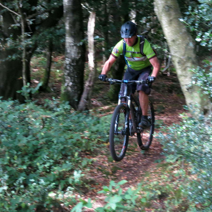 Next it was down a tricky descent (“where Karl stacked it and tried to give himself a new as*^ole”). Following D’Andy and DDub down the trail it was full on with big rain ruts, branches to catch you out and rocks all over. I was surprised to catch our down hill master D’Andy.